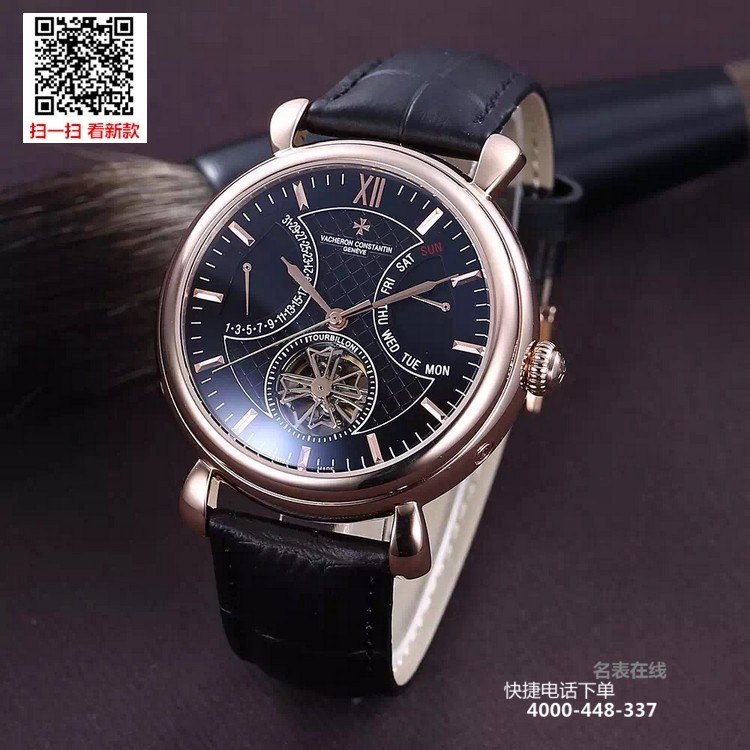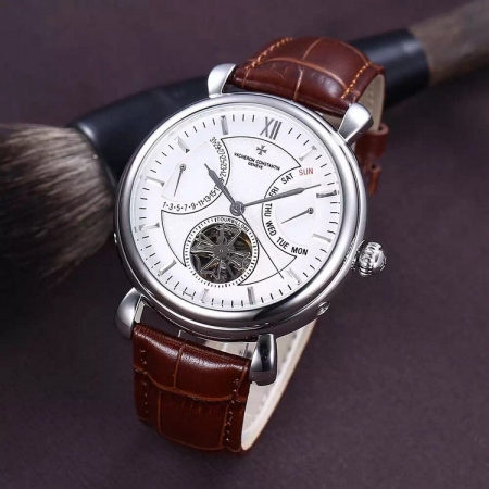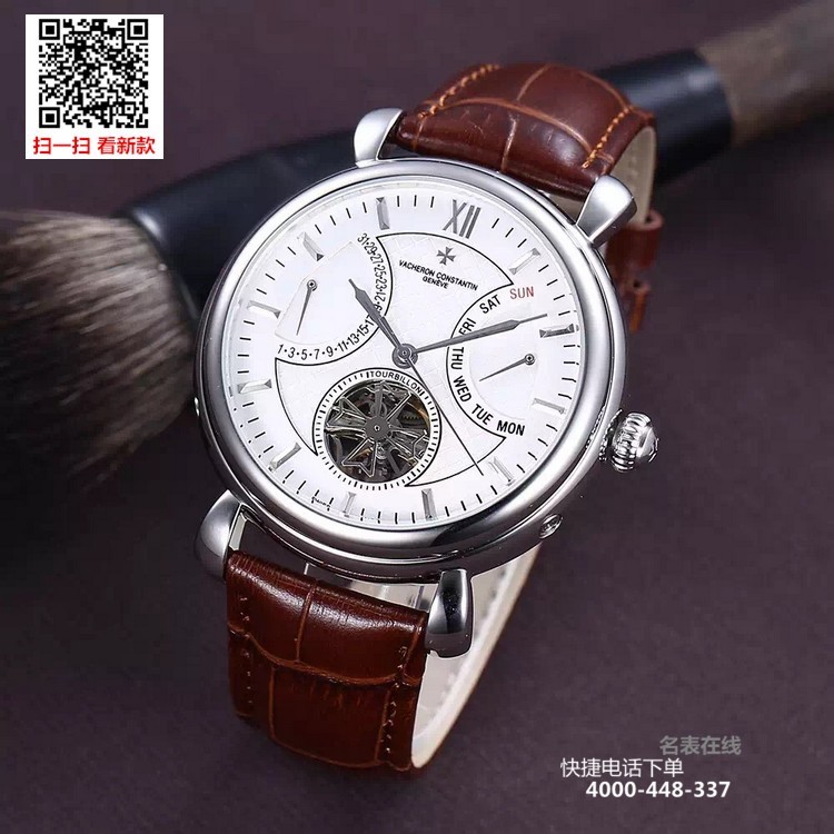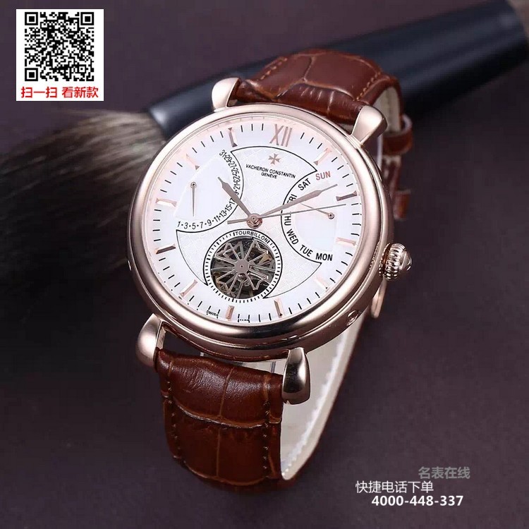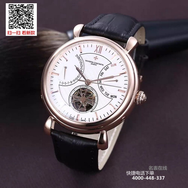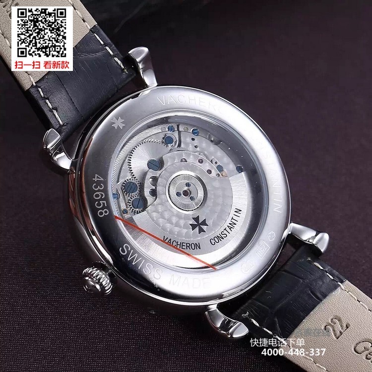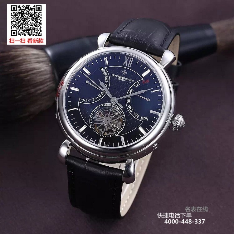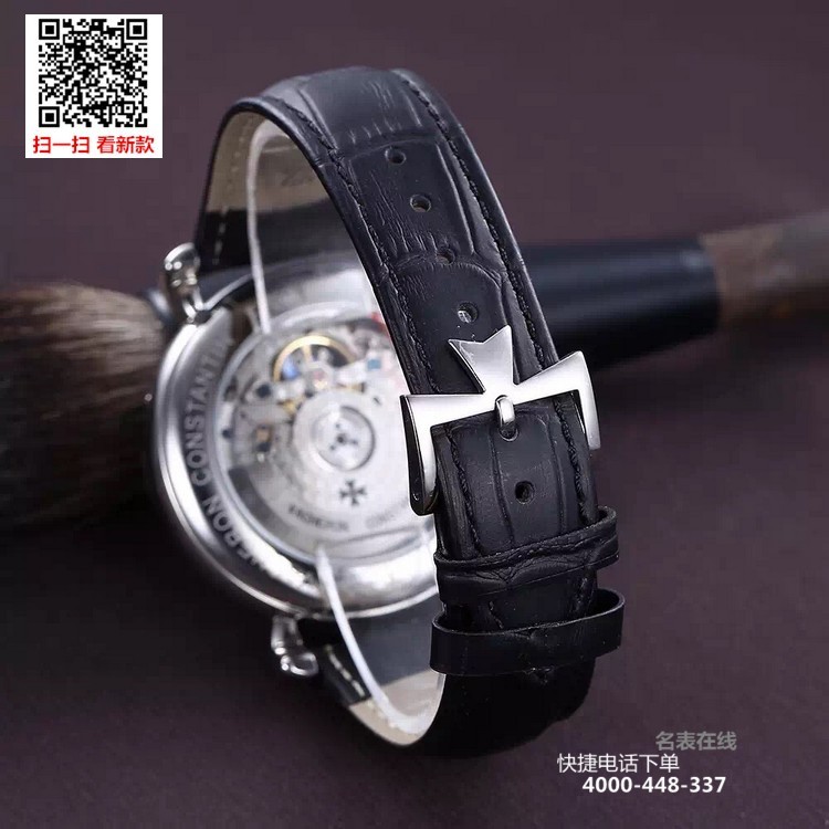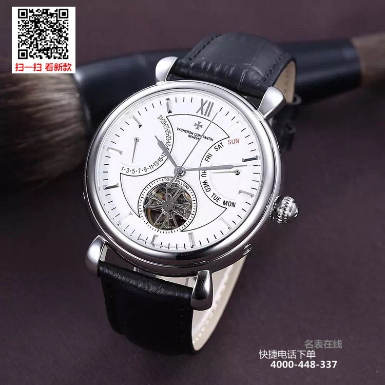 {品牌}:江诗丹顿{款式}:男款{尺寸}:直径约42mm{表带}:真皮表带{镜面}:蓝宝石抗划镜面{机芯}:瑞士ETA全自动机械机芯{防水}:50米{配件}:原装盒,说明书,质保卡,吊牌,香港机打发票