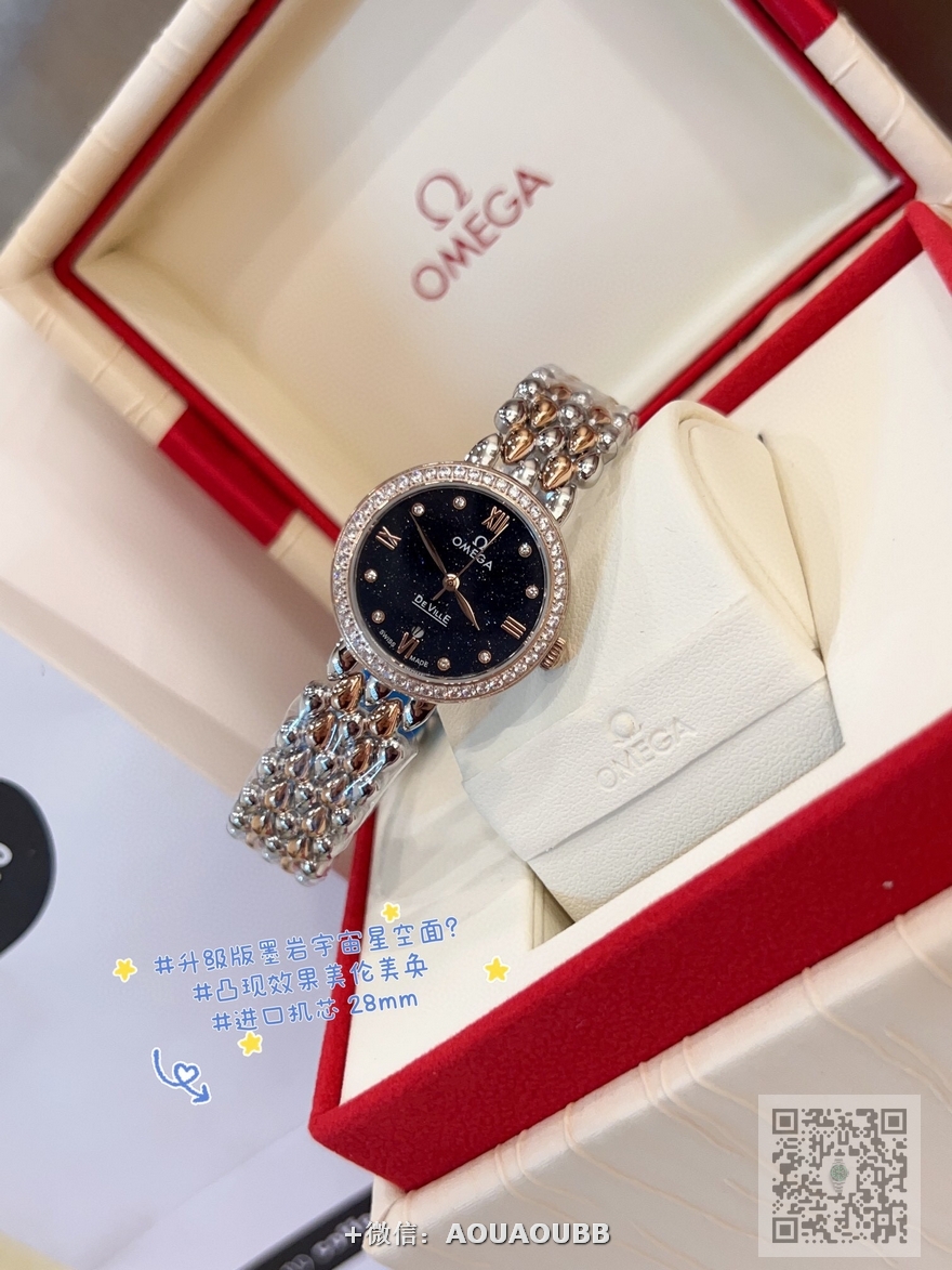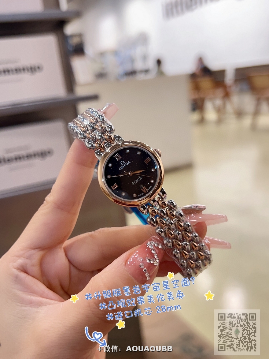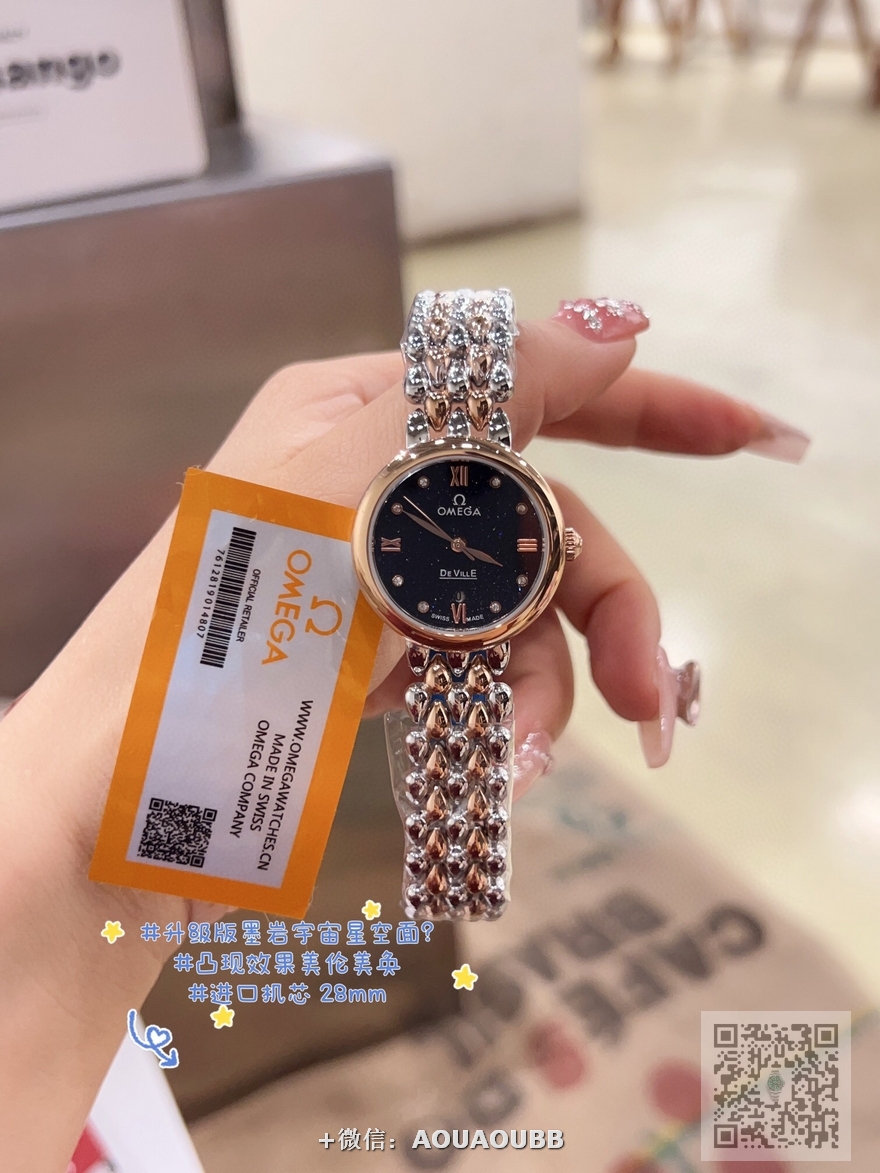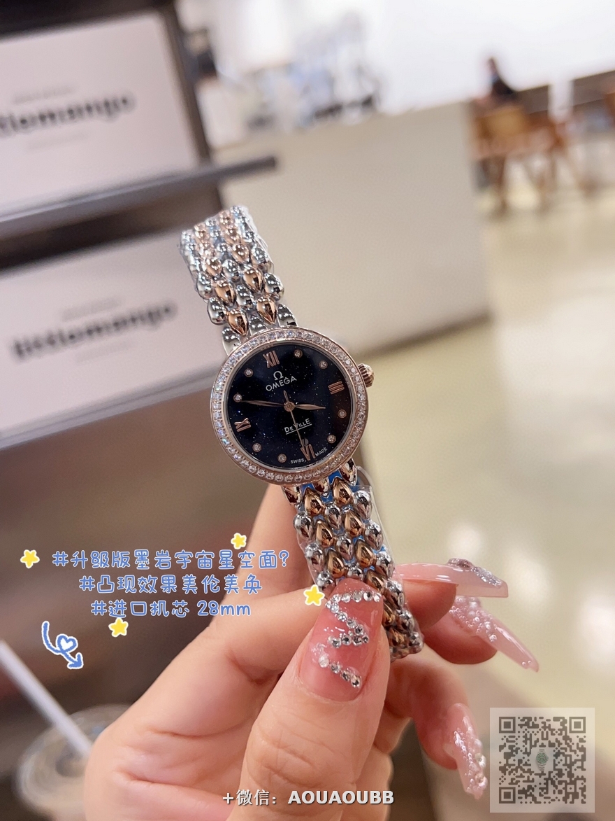 【品牌】欧米茄【产品介绍】欧米茄 OMEGA 精品女神水滴系列腕表。精致唯美的设计,让您的美丽无处不在,也将华丽与经典融合,创造出惊艳巨作,表盘清新淡雅,色彩的格调将华丽装点腕间,悦享浪漫之感。27mm【款式】女款【尺寸】直径27mm【表带】精钢表带【镜面】蓝宝石镜面【机芯】瑞士ETA石英机芯【防水】50米【配件】原装盒,说明书,质保卡,吊牌,香港机打发票【品质检测】保证所有手表实物拍摄,所见即所得 , 手表发货前都会有严格检查测试,确保您收到的手表无质量问题