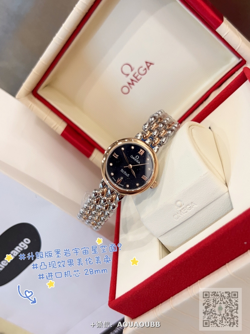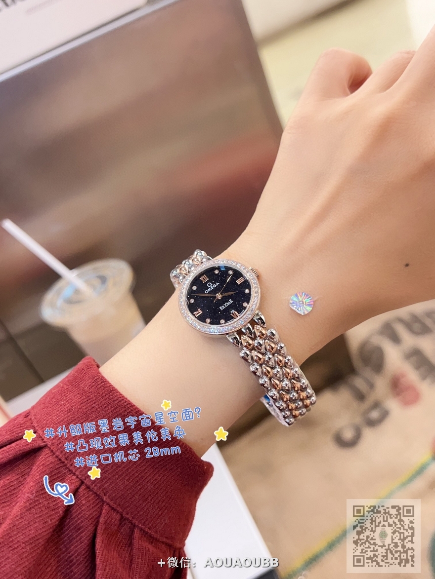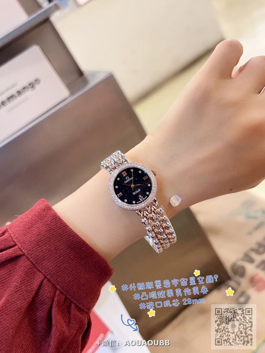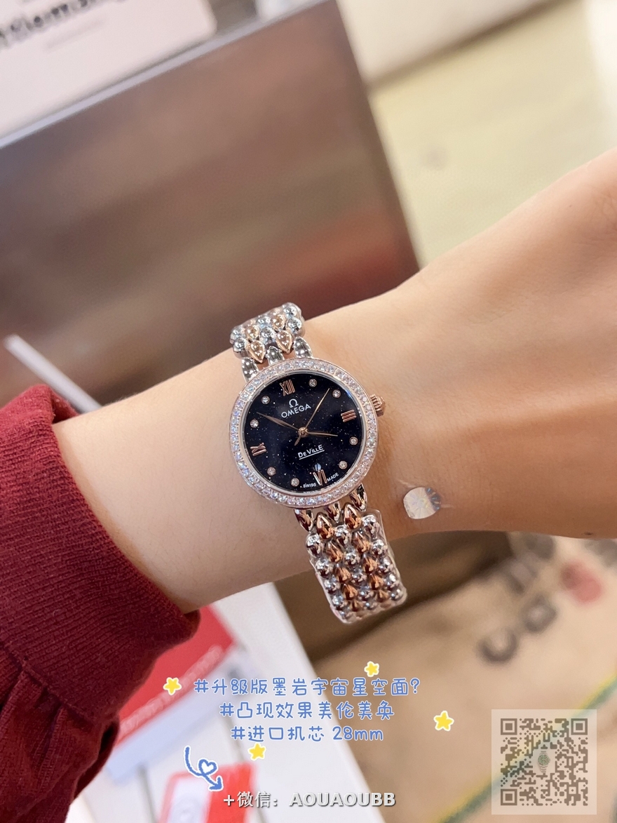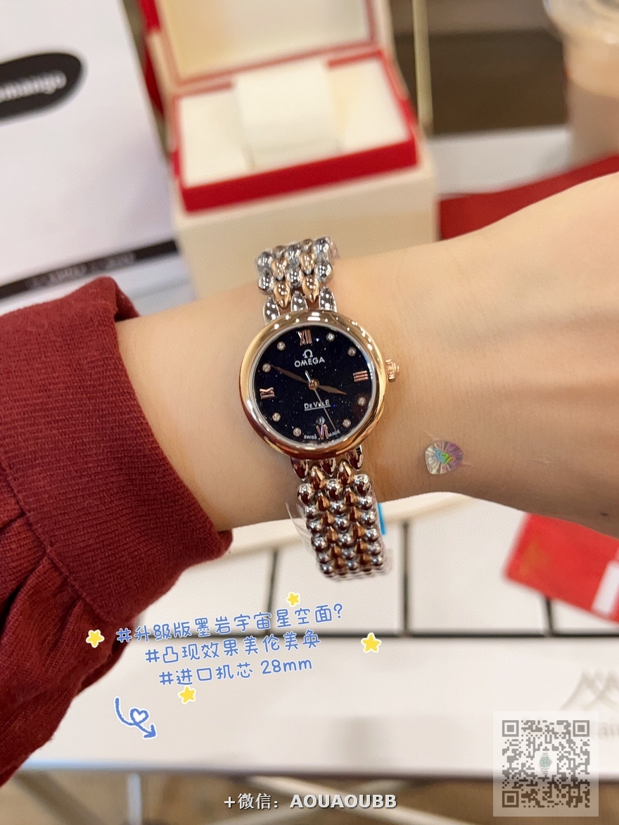【品牌】欧米茄【产品介绍】欧米茄 OMEGA 精品女神水滴系列腕表。精致唯美的设计,让您的美丽无处不在,也将华丽与经典融合,创造出惊艳巨作,表盘清新淡雅,色彩的格调将华丽装点腕间,悦享浪漫之感。27mm【款式】女款【尺寸】直径27mm【表带】精钢表带【镜面】蓝宝石镜面【机芯】瑞士ETA石英机芯【防水】50米【配件】原装盒,说明书,质保卡,吊牌,香港机打发票【品质检测】保证所有手表实物拍摄,所见即所得 , 手表发货前都会有严格检查测试,确保您收到的手表无质量问题