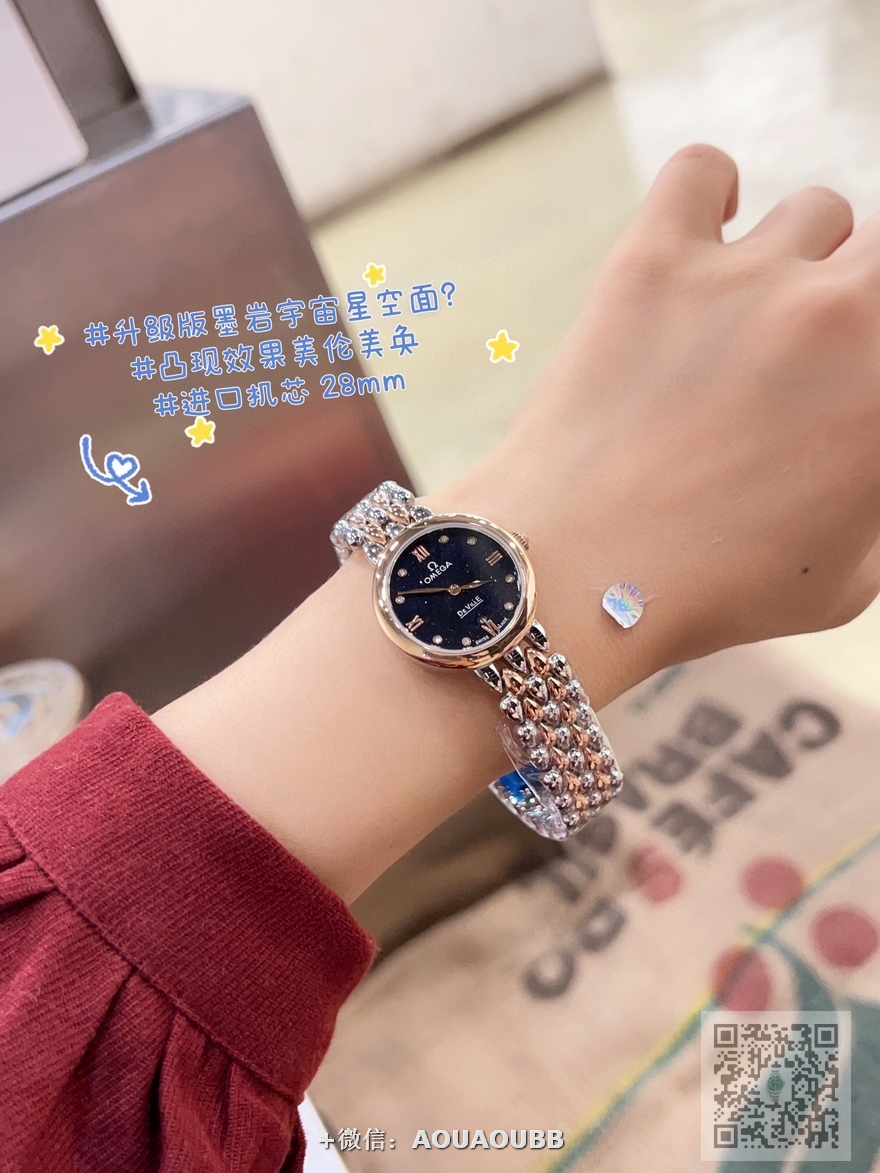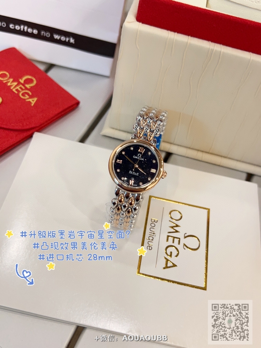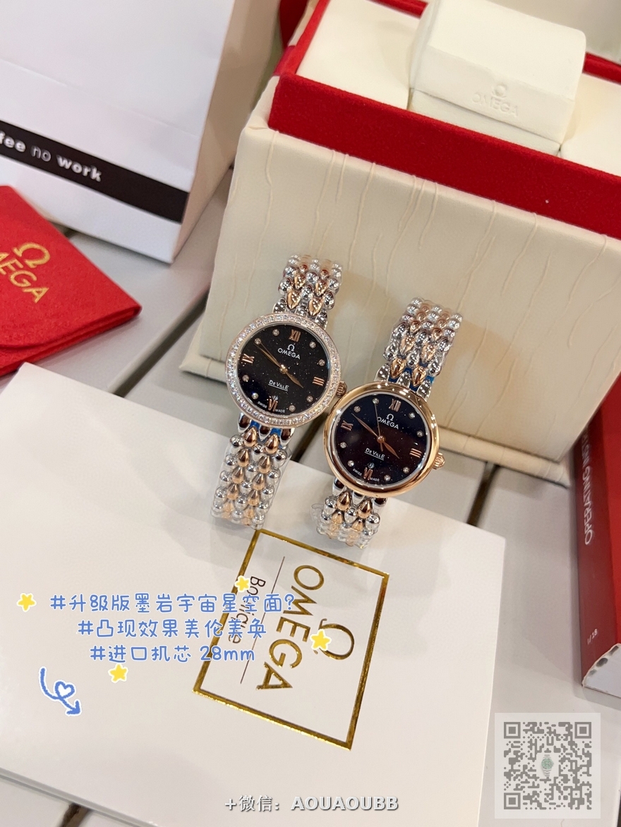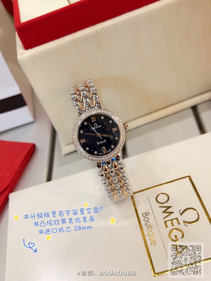 【品牌】欧米茄【产品介绍】欧米茄 OMEGA 精品女神水滴系列腕表。精致唯美的设计,让您的美丽无处不在,也将华丽与经典融合,创造出惊艳巨作,表盘清新淡雅,色彩的格调将华丽装点腕间,悦享浪漫之感。27mm【款式】女款【尺寸】直径27mm【表带】精钢表带【镜面】蓝宝石镜面【机芯】瑞士ETA石英机芯【防水】50米【配件】原装盒,说明书,质保卡,吊牌,香港机打发票【品质检测】保证所有手表实物拍摄,所见即所得 , 手表发货前都会有严格检查测试,确保您收到的手表无质量问题
