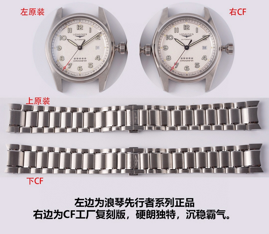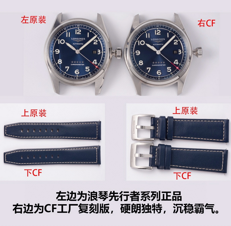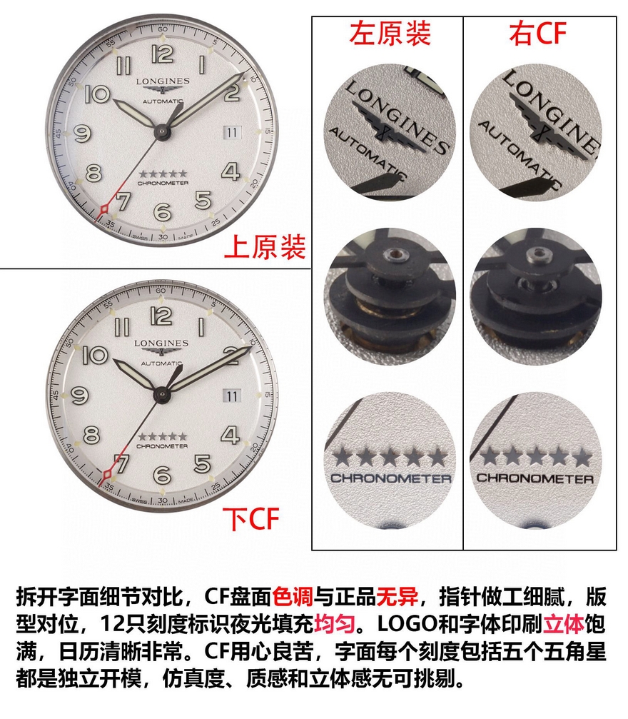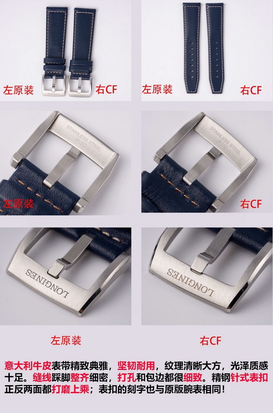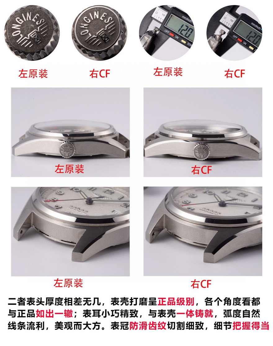 【品牌】浪琴【产品介绍】CF潜心研发浪琴SPIRIT先行者系列L3.810.4.73.6与L3.811.4.73.6腕表超级副本上市,浪琴最新的先行者五星上将与传统的名匠目前已经为浪琴最畅销的产品。CF团队与正品代工厂深度合作制作,全网独家正品拆解测绘,所有数据配件均可与正品完美通用互换,同步专柜尺寸40mm/42mm,采用正品一致的原装瑞士ETA2892基础机芯与TOP级别2892机芯配合三级打磨使之更加稳定耐用,打造原单品质的浪琴先行者系列腕表副本。【外观】购入几只正品拆解测绘,一致的阶梯式表壳壳套,一致的CNC打磨级别,一致的厚度尺寸,虽然是密底即使打开底盖也完全可以对比正品毫无压力。不怕拆才是王道,整表质感媲美正品。整表配件包括钢带生耳连每粒螺丝都可与正品完美互换。【盘面】白盘采用正品相同的颗粒纹理字面,蓝盘采用与正品相同的放射纹路字面,黑盘采用与原装一致的磨砂细微颗粒字面,颗粒的整体密度与正品吻合,在任何角度下均可以看出与正品相同的光源反射。每个数字字钉、logo、五角星、采用正品工艺材质独立开模,历经几套模具终使立体美感与原版一致。【夜光】夜光采用正品一致型号的瑞士C3超强夜光粉(1kg/20多w) 与正品一致强吸光15分钟,夜光效果4-6小时,几十年经验夜光填充匠人手工填制,速度极其缓慢。每个数字刻度与指针填充均衡毫无溢出的原装进口瑞士C3超强夜光粉,不管是每个数字刻度与指针的制作工艺材质及颜色还有夜光的自然外观颜色均可以完全匹敌正品。【镜面】正品级别的双面镀蓝膜弧面蓝宝石玻璃表镜,双面倒角光边圆滑处理,厚度弧度达到严苛的0.03公差标准。防刮耐磨,晶莹剔透。【防水】锁把式表冠经反复检验测试与正品一致防水深度10巴。【钢带】钢带从胚料开始即遵循了严格的标准,每一节钢带都经CNC反复打磨均为上品,拉丝纹路细腻整齐且拉丝深度与正品完全一致,不仅仅做到拉丝的密度细腻一致,并且还要做到拉丝的深度保持与正品一致。表扣深度还原,解决了使用一段时间就扣不紧松动的尴尬问题,使表扣使用久了还是严丝合缝,连扣上表扣的清脆响声也深度还原。【皮带】采用与正品一致的法国头层小牛皮,柔软细腻贴合手腕佩戴舒适,每一寸缝线与每个细节包括编号都与正品一致。【可以媲美正品的机芯】采用了与正品一致的ETA2892基础机芯作为基础进行二次开发,按正品三级打磨方式精密打磨L888.4机芯,ETA钢印日内瓦纹珍珠圆纹机芯编码机芯型号和机芯编号都与正品一致。为追求完美,CF团队不惜成本耗时良久研发的机芯轴承结构与原装一致,避免了市场普通的轴承假贴片一眼假的尴尬。日历盘再也不用担心卡日历的问题,放弃了成本略低的黏贴式的日历盘安装方式,采用原装一致的日历盘安装,使日历转动流畅清晰。【品控】CF团队近乎苛刻的严谨品控,每枚机芯的品控从源头出发,每一只腕表出厂前都经CF制表师调试至最佳状态并附带机芯检测报告单一份,随表附送正品一致的头层牛皮皮套与五码合一。CF始终坚持初心,追求完美!将持续为各界表友打造原单品质的浪琴腕表副本。CF 只做浪琴的工匠工厂!【款式】男款【尺寸】直径40mm【表带】牛皮表带【镜面】蓝宝石镜面【机芯】ETA2892改L888.4机芯(复刻正品机型)【防水】50米【配件】原装盒,说明书,质保卡,吊牌,香港机打发票【品质检测】保证所有手表实物拍摄,所见即所得 , 手表发货前都会有严格检查测试,确保您收到的手表无质量问题
