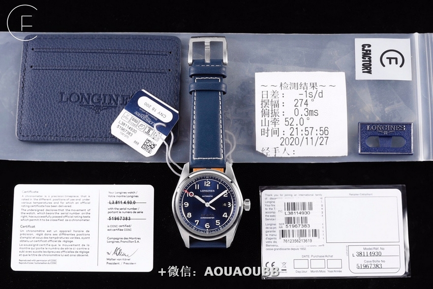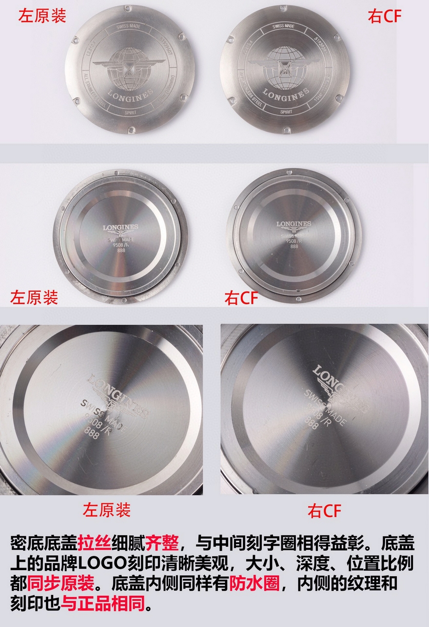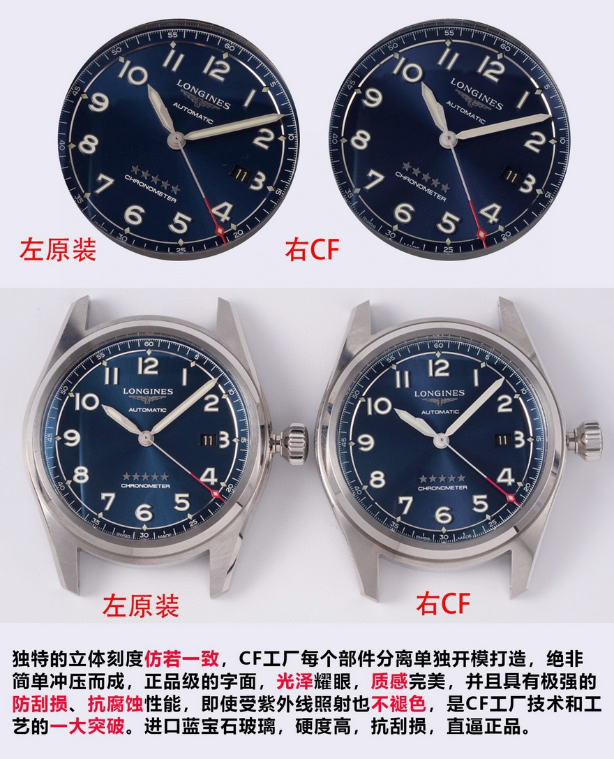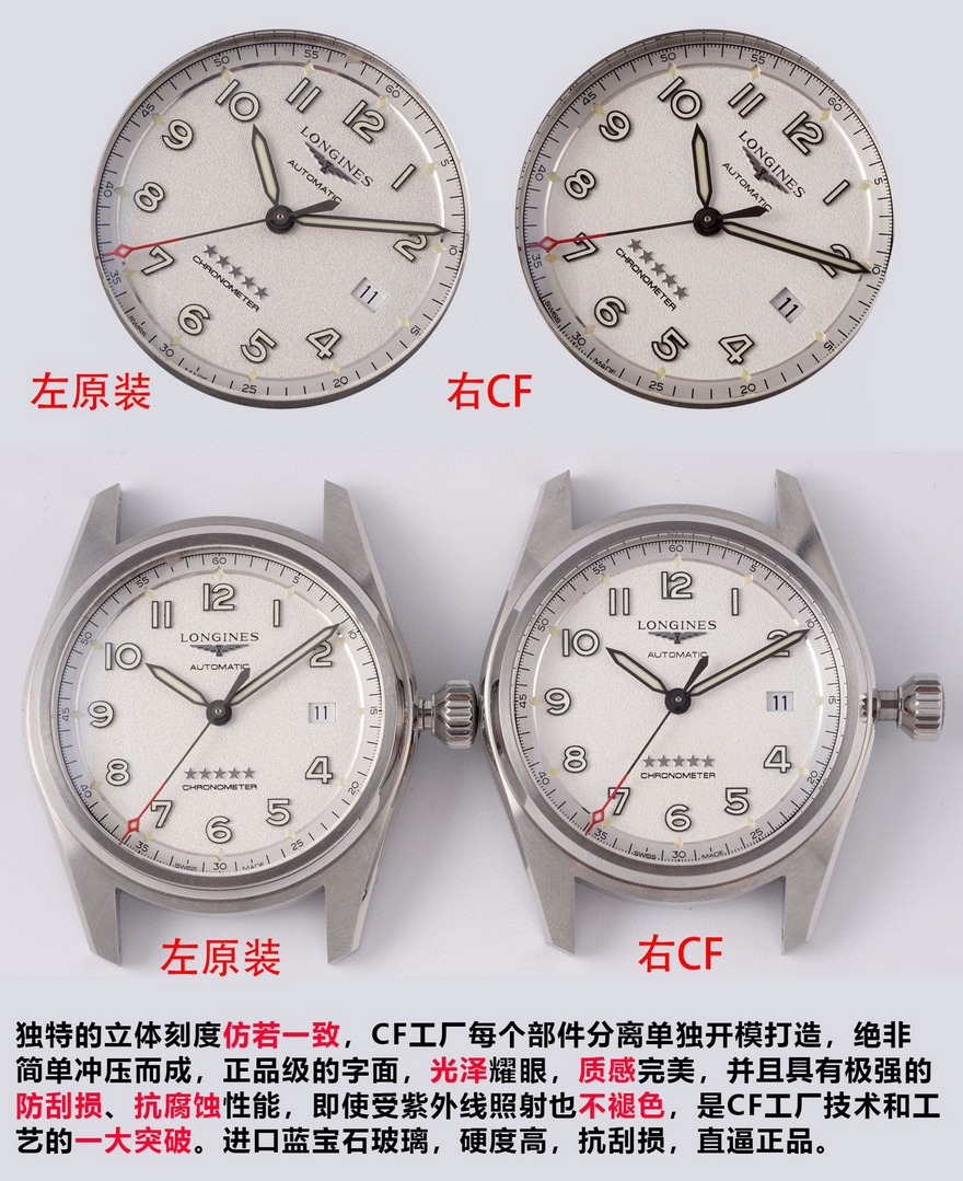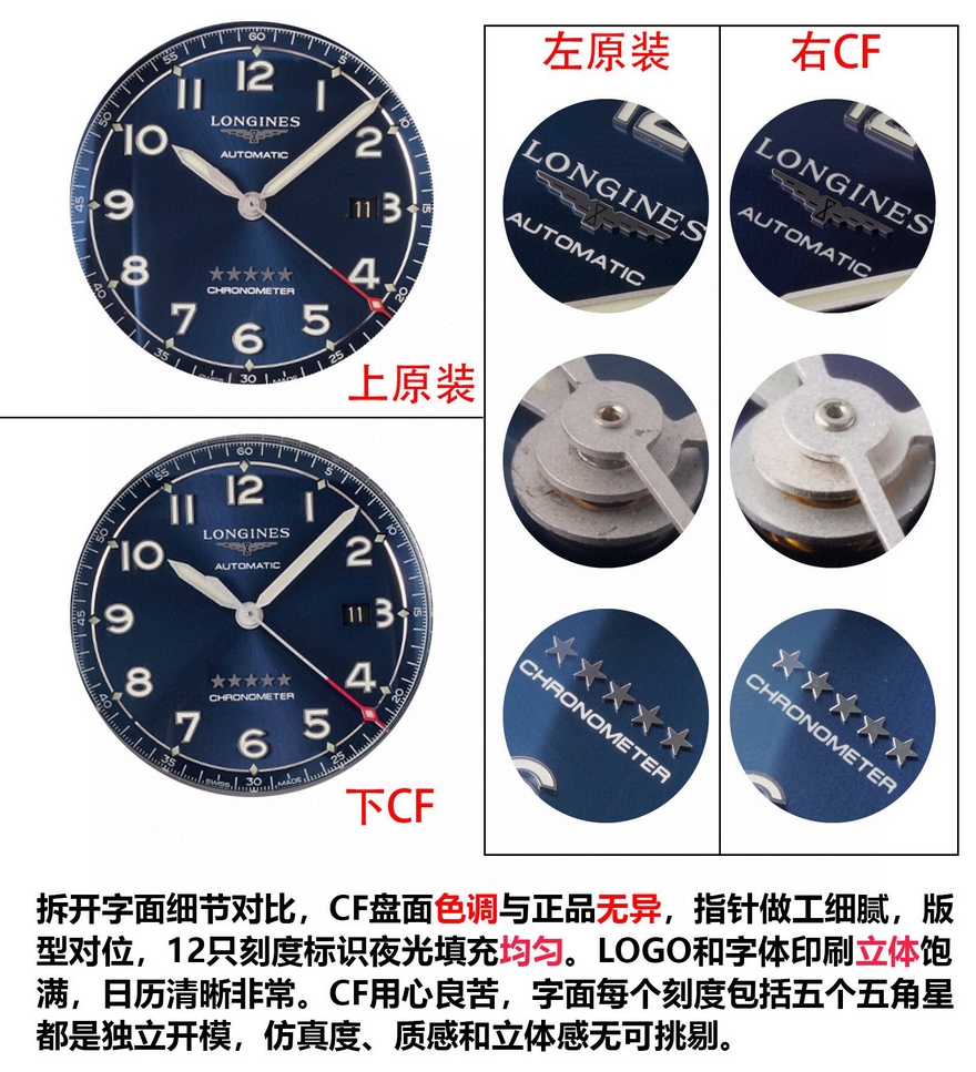 【品牌】浪琴【产品介绍】CF潜心研发浪琴SPIRIT先行者系列L3.810.4.73.6与L3.811.4.73.6腕表超级副本上市,浪琴最新的先行者五星上将与传统的名匠目前已经为浪琴最畅销的产品。CF团队与正品代工厂深度合作制作,全网独家正品拆解测绘,所有数据配件均可与正品完美通用互换,同步专柜尺寸40mm/42mm,采用正品一致的原装瑞士ETA2892基础机芯与TOP级别2892机芯配合三级打磨使之更加稳定耐用,打造原单品质的浪琴先行者系列腕表副本。【外观】购入几只正品拆解测绘,一致的阶梯式表壳壳套,一致的CNC打磨级别,一致的厚度尺寸,虽然是密底即使打开底盖也完全可以对比正品毫无压力。不怕拆才是王道,整表质感媲美正品。整表配件包括钢带生耳连每粒螺丝都可与正品完美互换。【盘面】白盘采用正品相同的颗粒纹理字面,蓝盘采用与正品相同的放射纹路字面,黑盘采用与原装一致的磨砂细微颗粒字面,颗粒的整体密度与正品吻合,在任何角度下均可以看出与正品相同的光源反射。每个数字字钉、logo、五角星、采用正品工艺材质独立开模,历经几套模具终使立体美感与原版一致。【夜光】夜光采用正品一致型号的瑞士C3超强夜光粉(1kg/20多w) 与正品一致强吸光15分钟,夜光效果4-6小时,几十年经验夜光填充匠人手工填制,速度极其缓慢。每个数字刻度与指针填充均衡毫无溢出的原装进口瑞士C3超强夜光粉,不管是每个数字刻度与指针的制作工艺材质及颜色还有夜光的自然外观颜色均可以完全匹敌正品。【镜面】正品级别的双面镀蓝膜弧面蓝宝石玻璃表镜,双面倒角光边圆滑处理,厚度弧度达到严苛的0.03公差标准。防刮耐磨,晶莹剔透。【防水】锁把式表冠经反复检验测试与正品一致防水深度10巴。【钢带】钢带从胚料开始即遵循了严格的标准,每一节钢带都经CNC反复打磨均为上品,拉丝纹路细腻整齐且拉丝深度与正品完全一致,不仅仅做到拉丝的密度细腻一致,并且还要做到拉丝的深度保持与正品一致。表扣深度还原,解决了使用一段时间就扣不紧松动的尴尬问题,使表扣使用久了还是严丝合缝,连扣上表扣的清脆响声也深度还原。【皮带】采用与正品一致的法国头层小牛皮,柔软细腻贴合手腕佩戴舒适,每一寸缝线与每个细节包括编号都与正品一致。【可以媲美正品的机芯】采用了与正品一致的ETA2892基础机芯作为基础进行二次开发,按正品三级打磨方式精密打磨L888.4机芯,ETA钢印日内瓦纹珍珠圆纹机芯编码机芯型号和机芯编号都与正品一致。为追求完美,CF团队不惜成本耗时良久研发的机芯轴承结构与原装一致,避免了市场普通的轴承假贴片一眼假的尴尬。日历盘再也不用担心卡日历的问题,放弃了成本略低的黏贴式的日历盘安装方式,采用原装一致的日历盘安装,使日历转动流畅清晰。【品控】CF团队近乎苛刻的严谨品控,每枚机芯的品控从源头出发,每一只腕表出厂前都经CF制表师调试至最佳状态并附带机芯检测报告单一份,随表附送正品一致的头层牛皮皮套与五码合一。CF始终坚持初心,追求完美!将持续为各界表友打造原单品质的浪琴腕表副本。CF 只做浪琴的工匠工厂!【款式】男款【尺寸】直径40mm【表带】牛皮表带【镜面】蓝宝石镜面【机芯】ETA2892改L888.4机芯(复刻正品机型)【防水】50米【配件】原装盒,说明书,质保卡,吊牌,香港机打发票【品质检测】保证所有手表实物拍摄,所见即所得 , 手表发货前都会有严格检查测试,确保您收到的手表无质量问题